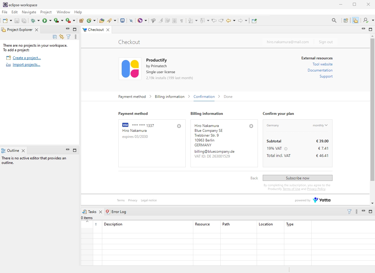 Yatta Checkout for Eclipse helps you remove friction from your purchase funnel and improves your end users’ UX. With the in-app integration, everything is in the Eclipse IDE.