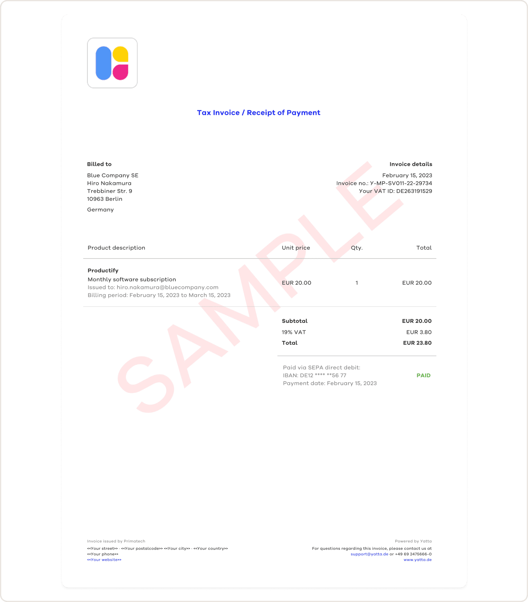 The sent invoices include legally required information about the company issuing the invoice (i.e., you), the recipient and the transaction. In addition, invoices include your logo and contact information. Please note, however, that we cannot assume liability for the correctness of the VAT calculation shown on the invoice.