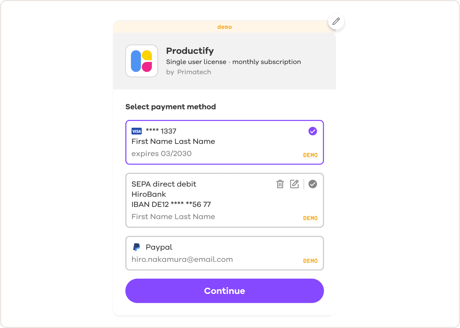 To test Yatta Checkout, simply use your user account. In the checkout process, you will see demo payment methods and billing information. You cannot use real payment data here, but you can create as much demo billing information as you like to simulate purchases from different countries.