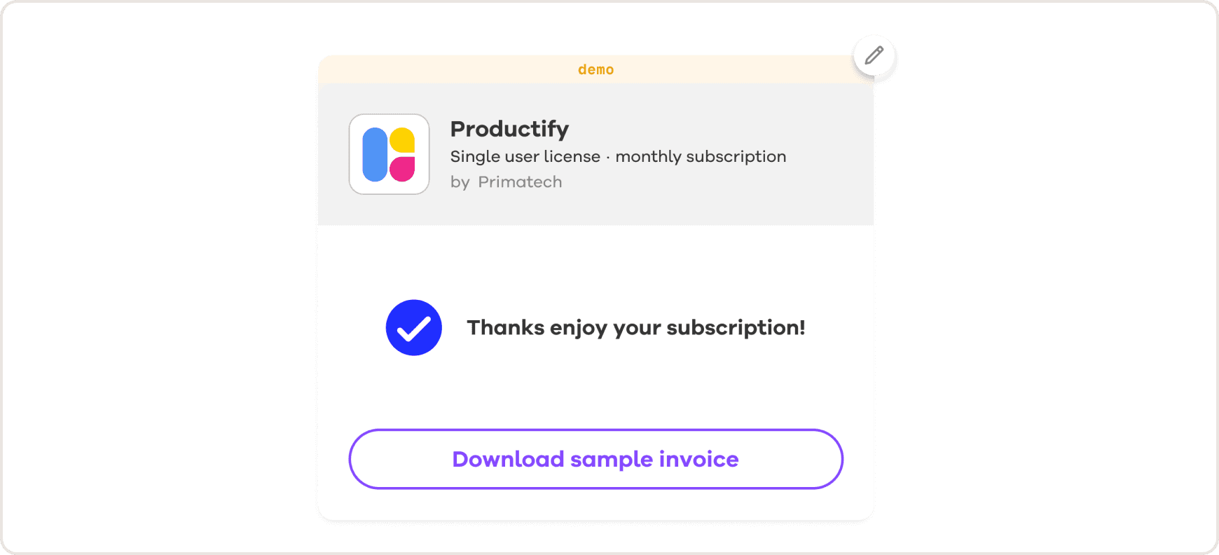Each product has a preview and a live version. When you first create a product, it is always in preview mode. The information in this section applies only to the preview version and to preview purchases. The purchase process for preview products is exactly the same as for live ones. The only difference is that a preview purchase triggers no automatic emails and you will be sent no purchase invoice. For details, see the section "Invoices and emails" below.