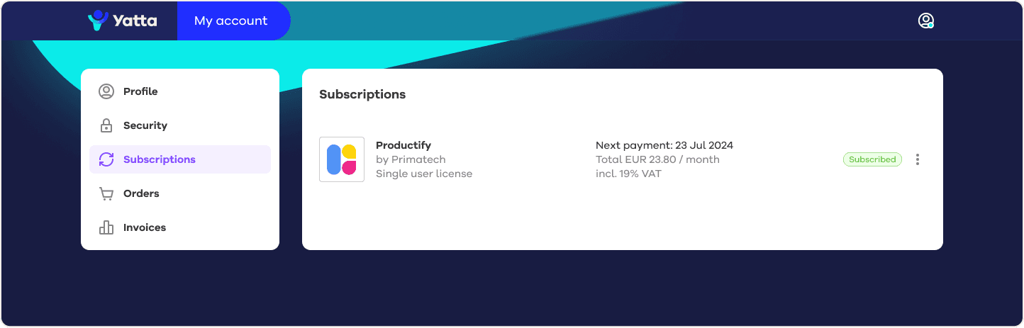 Access your user account to view and manage your current preview subscriptions and orders. Subscriptions can also be canceled by reopening the Checkout. This will open the normal manage product view, where you can cancel subscriptions directly. In Eclipse you can also cancel subscriptions via Preferences.