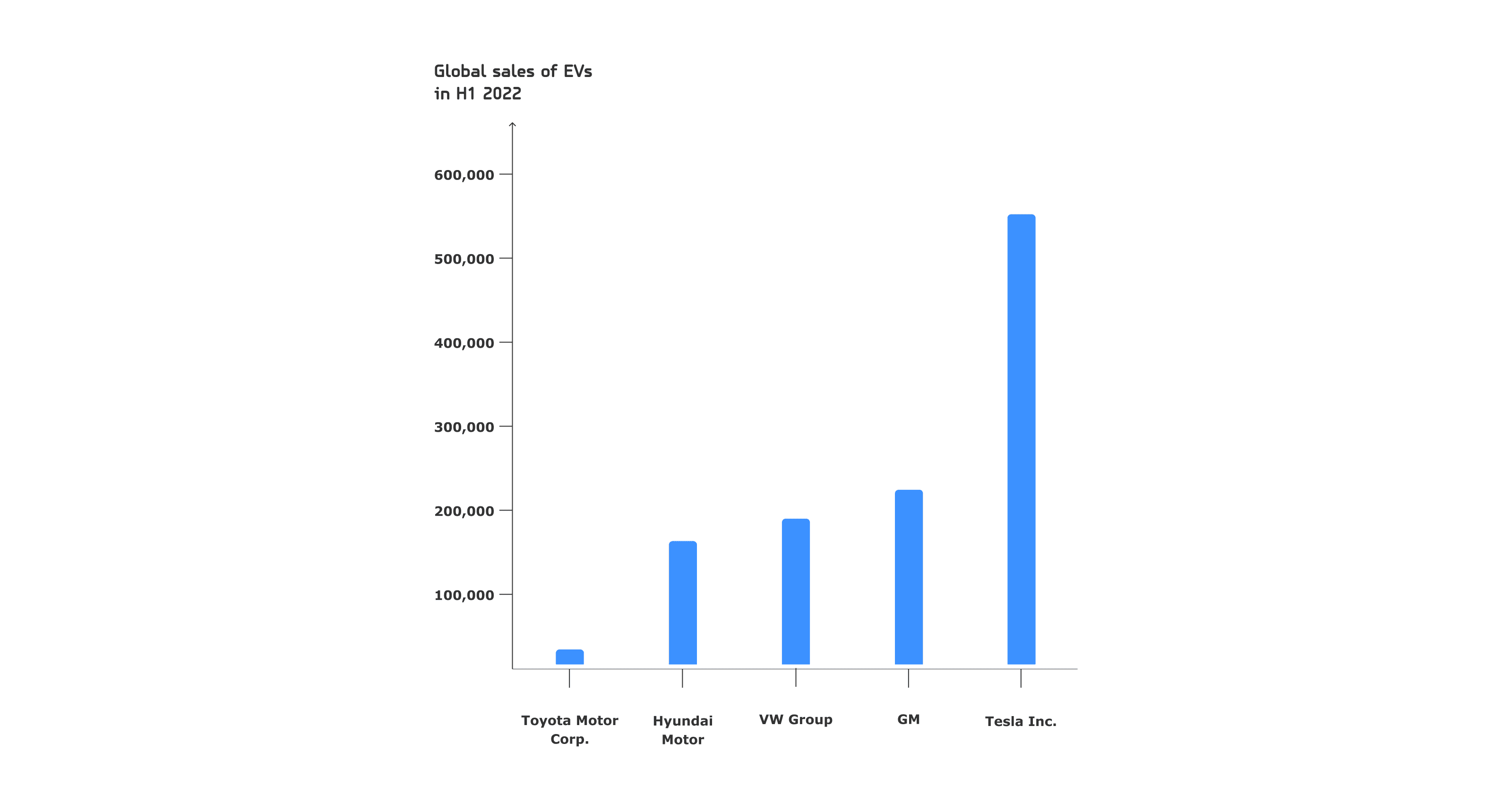 Tesla currently has a larger market share than any other EV manufacturer, selling 565,000 cars in the first two quarters of 2022. In the same period, GM sold roughly 250,000, the Volkswagen Group (including Audi and Porsche) slightly above 200,000 EVs and Hyundai slightly below (source). Toyota, who was the undisputed king of hybrid cars for 25 years is still a dwarf in the EV market, with around 10,000 sold units.